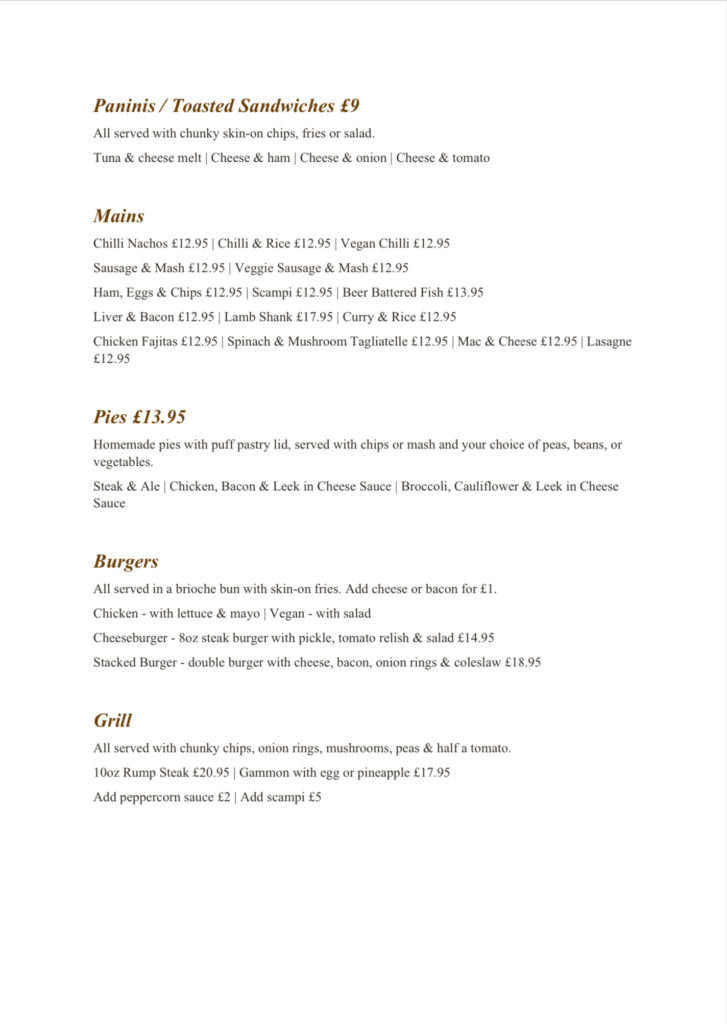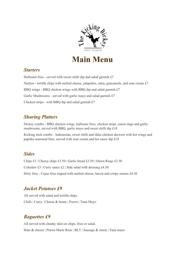 The Kicking Dickey serves a menu of good home cooked pub food, our team take pride in our menus and have provided dishes that are freshly prepared, traditional pub meals for the perfect relaxed dining experience. Our menu includes baguettes and paninis, jacket potatoes, burgers, pies, fish and chips, steaks and grills and every Sunday a traditional roast. All our meats are from Steeles Butchers and our Sunday vegetables are from the Modern greengrocer in Great Dunmow. The menu includes options for all dietary requirements including vegetarian, vegan and gluten free options.